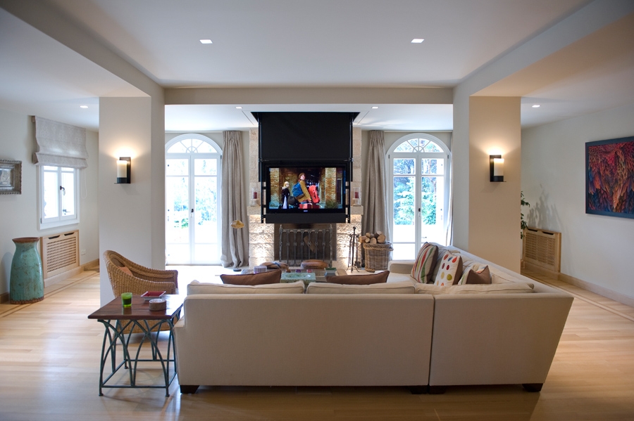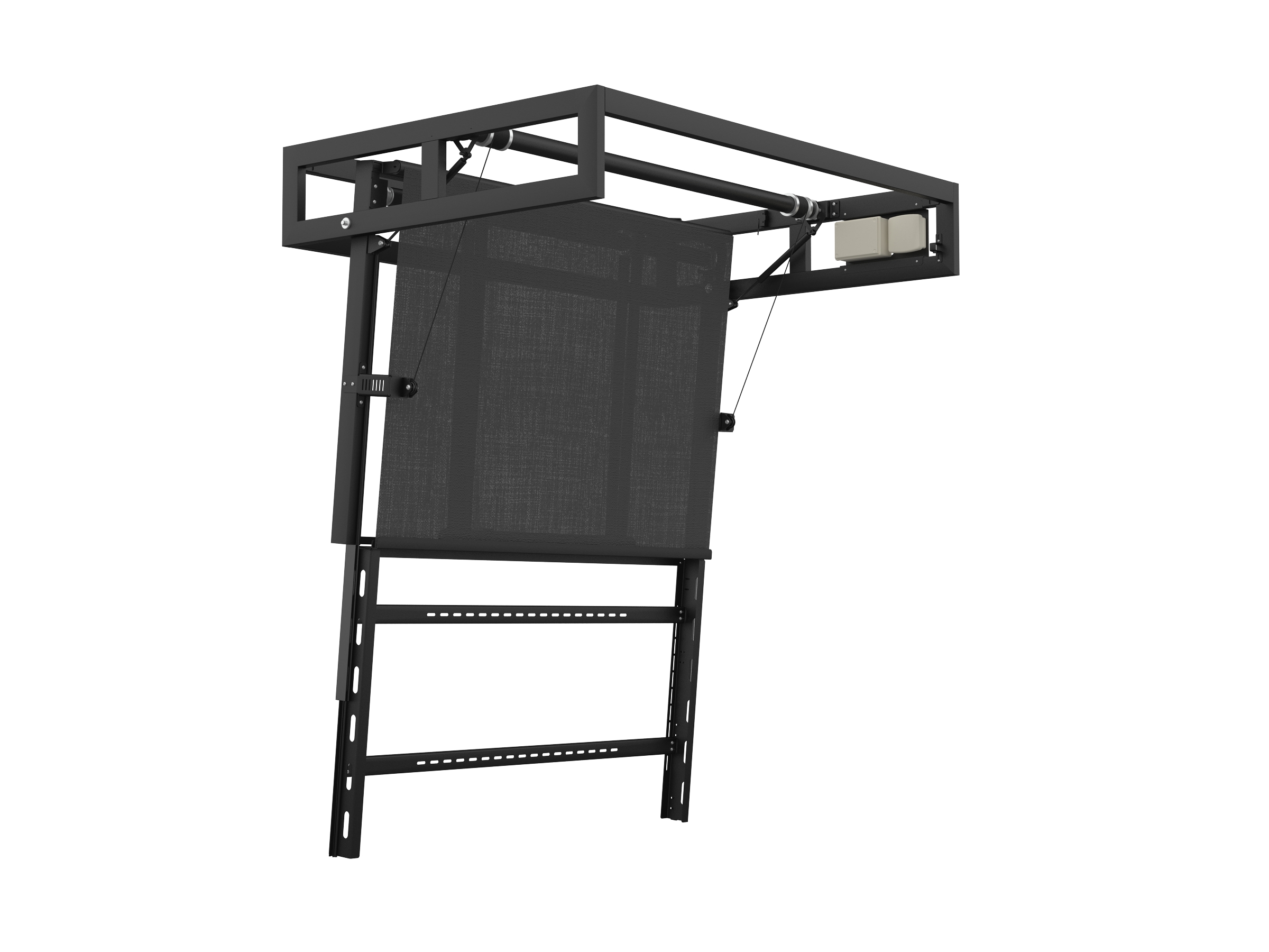 Flat panel ceiling lift (TV lift), type FPLC V3-900U suitable for 65" & 75" TV sets, with hinge opening motion and  TV vertical descent by 900mm. When the lift is in closed position, the TV faces upwards.