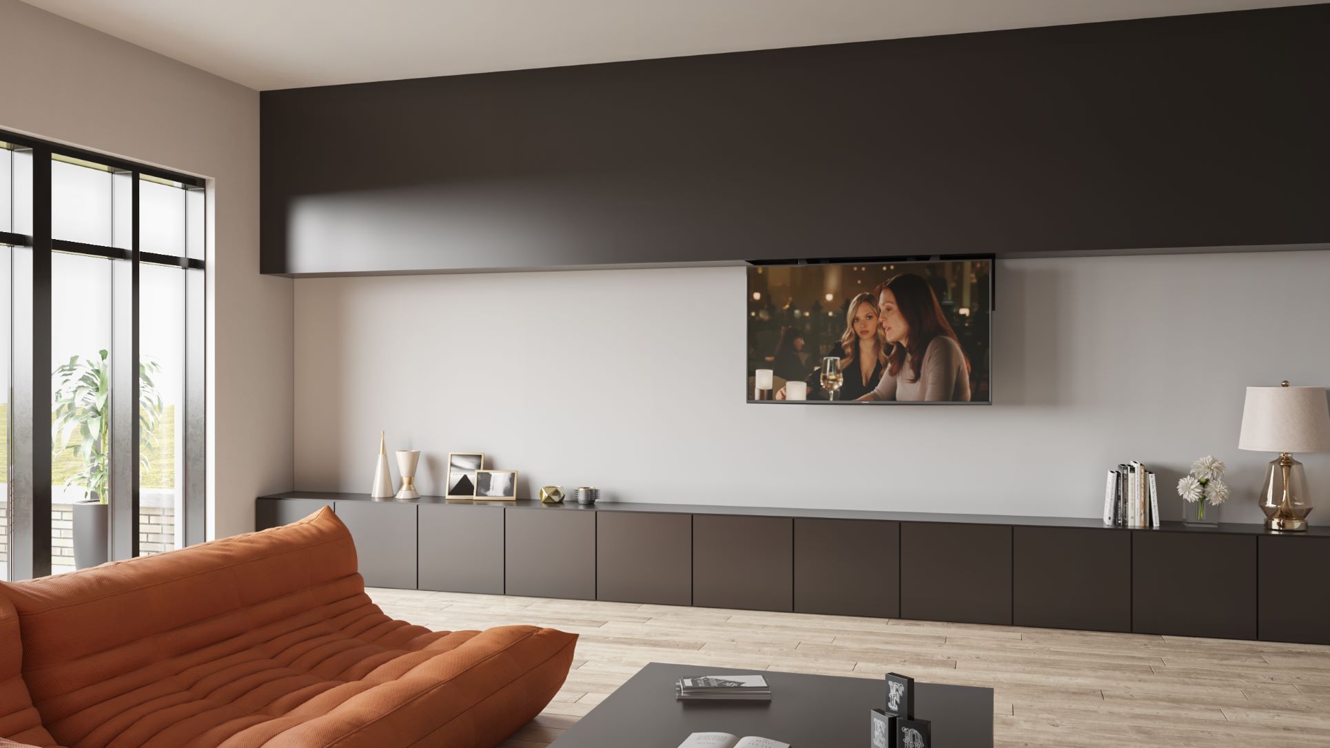 Flat panel mechanism for vertical motion of panel from inside false wall, false ceiling or furniture.