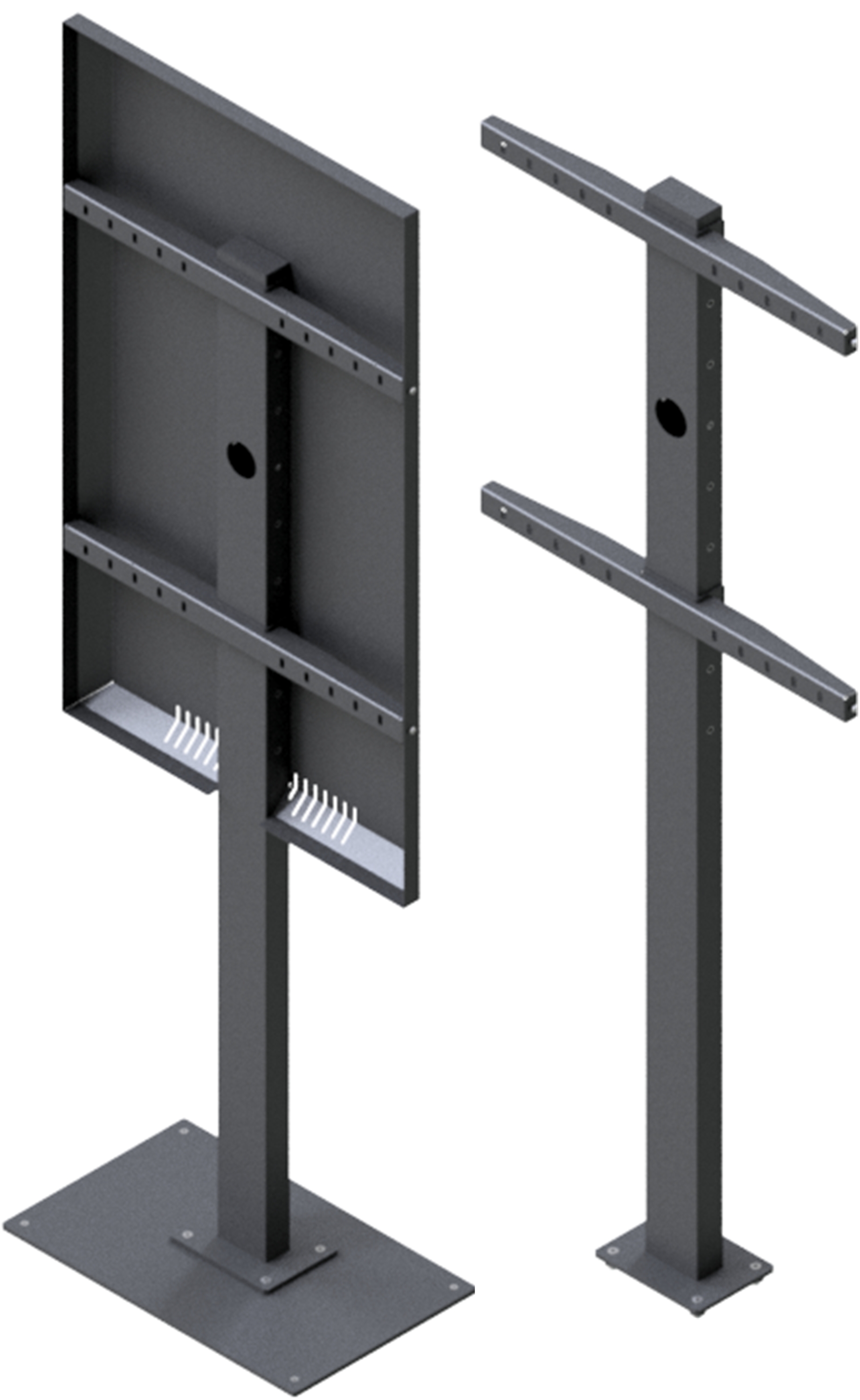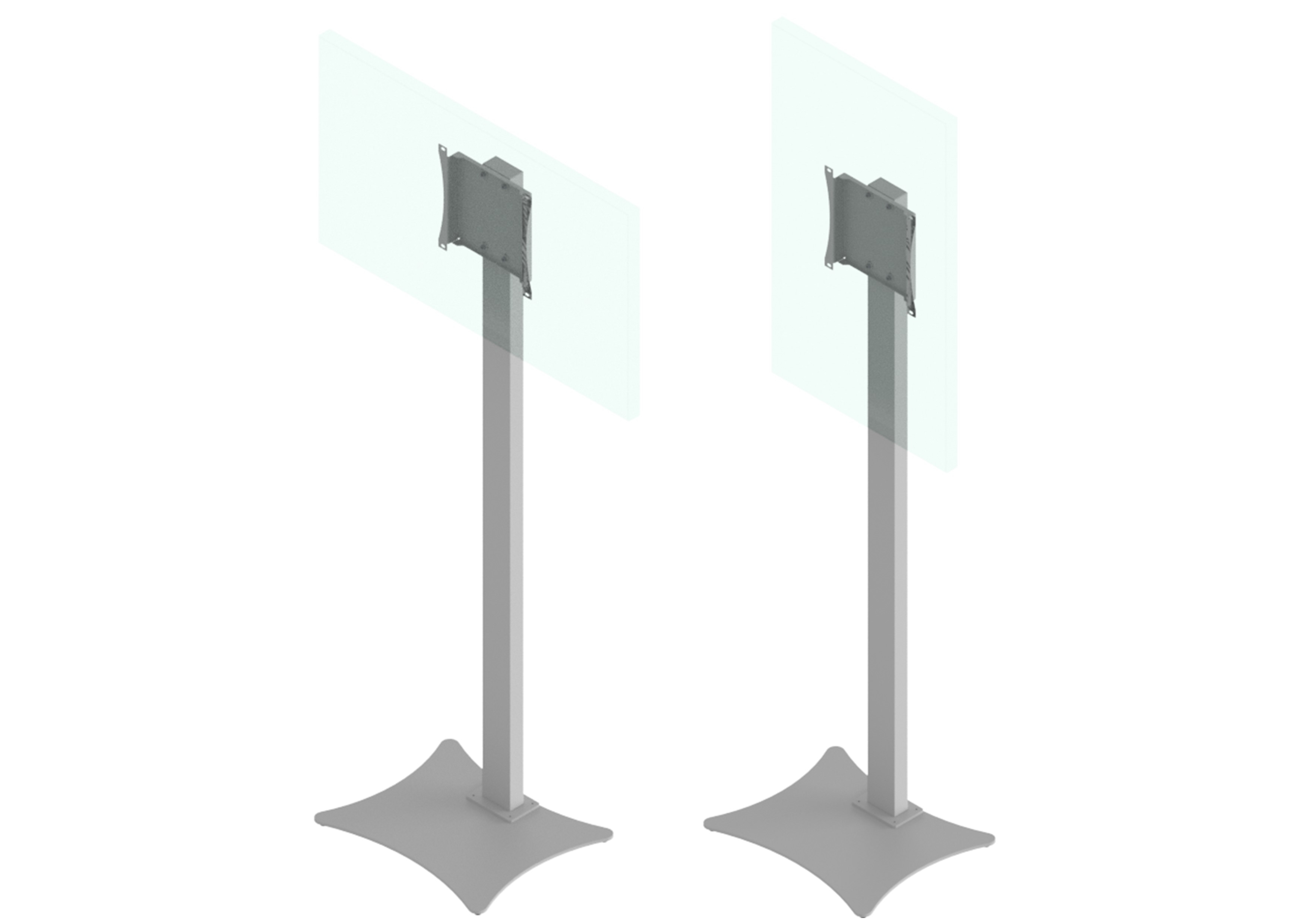 Flat panel floor stand suitable for fixed mounting or free standing in front of vitrins application, with our without back cover. Monitor mounting in portrait or landscape orientation.