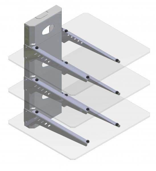 Elegant equipment rack for installation on wall or furniture, providing full wire coverage, suitable for any kind of connector or plug and with the ability to bear up to 3 shelves.